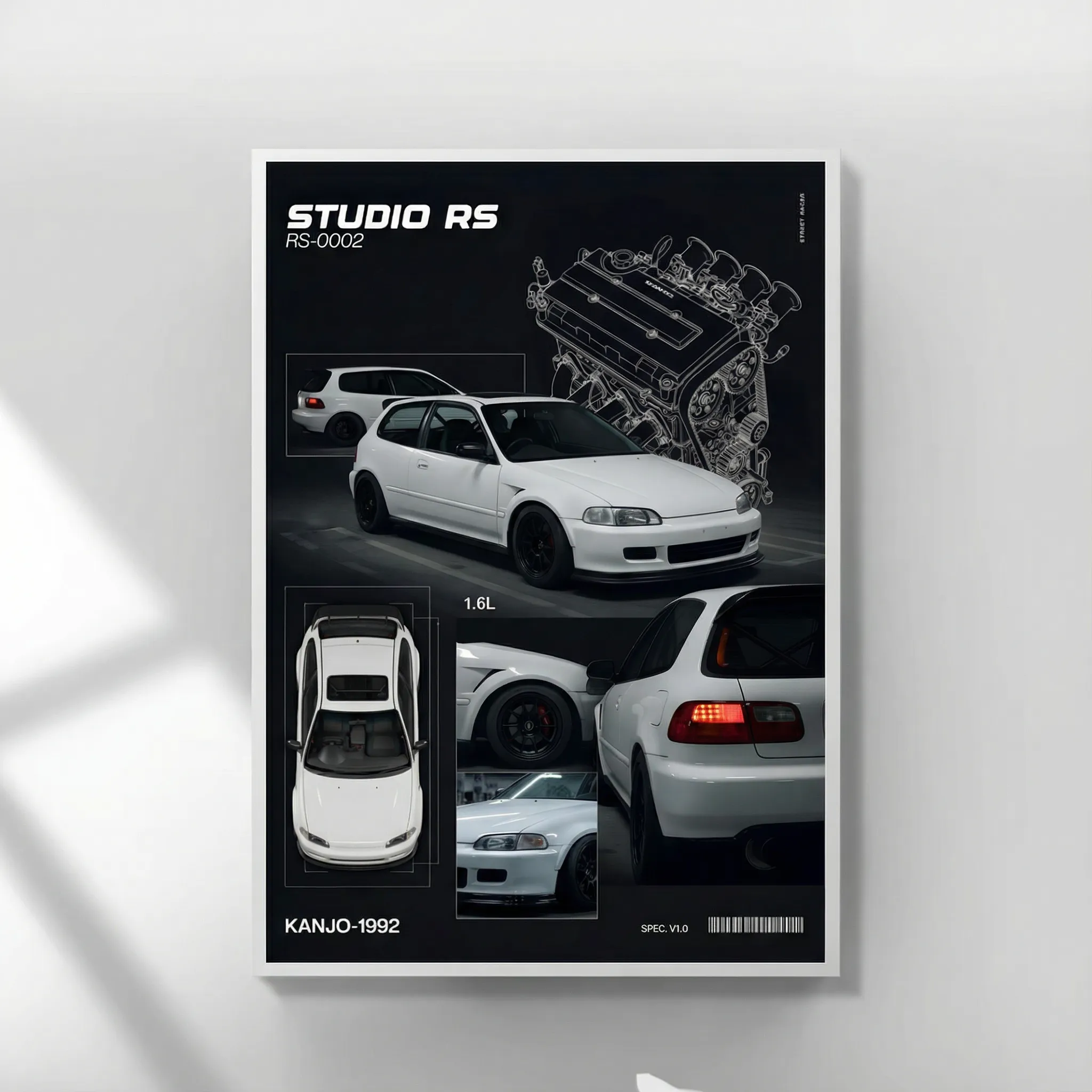 トップビュー、リアディテール、エンジン透視図を組み合わせ、“ストリートで育ったクルマ”のリアルな背景を可視化しています。走りを知る人ほど刺さる、通好みの一枚です。