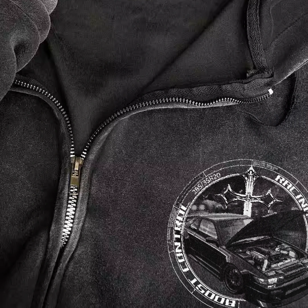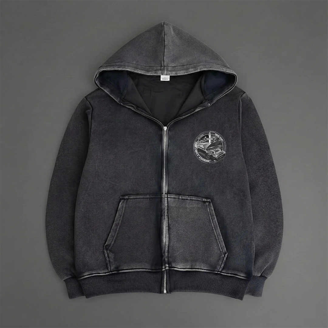 胸元にモノクロのグラフィックを落とし込んだジップフーディ。
