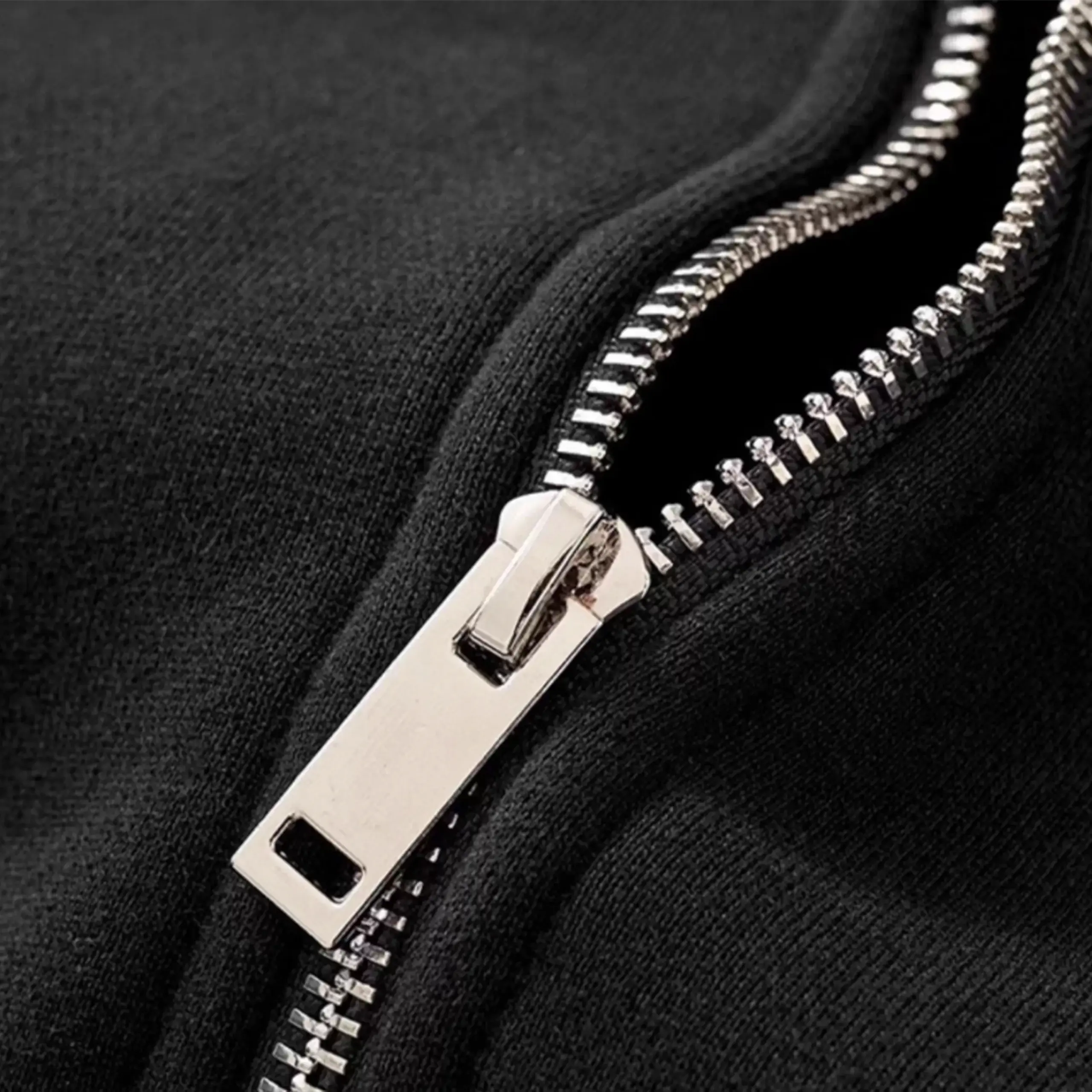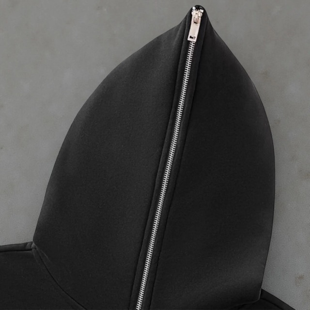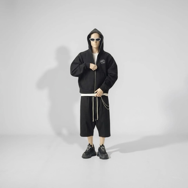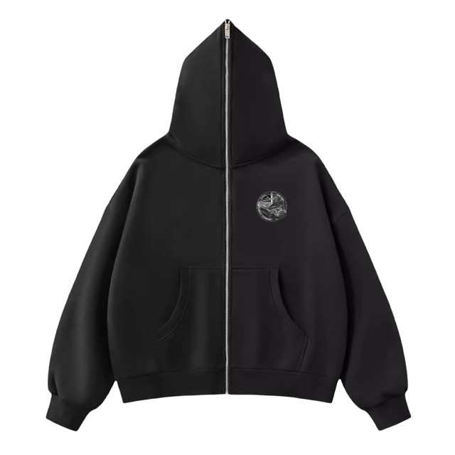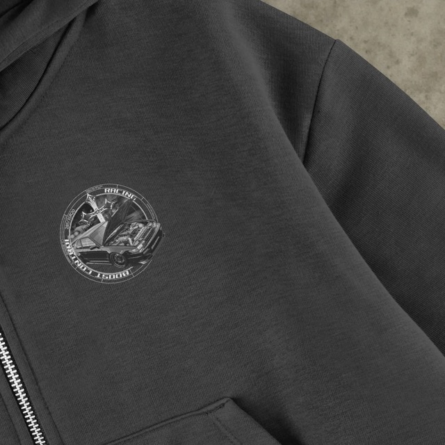 胸元にモノクロームのグラフィックを配置したジップフーディ。